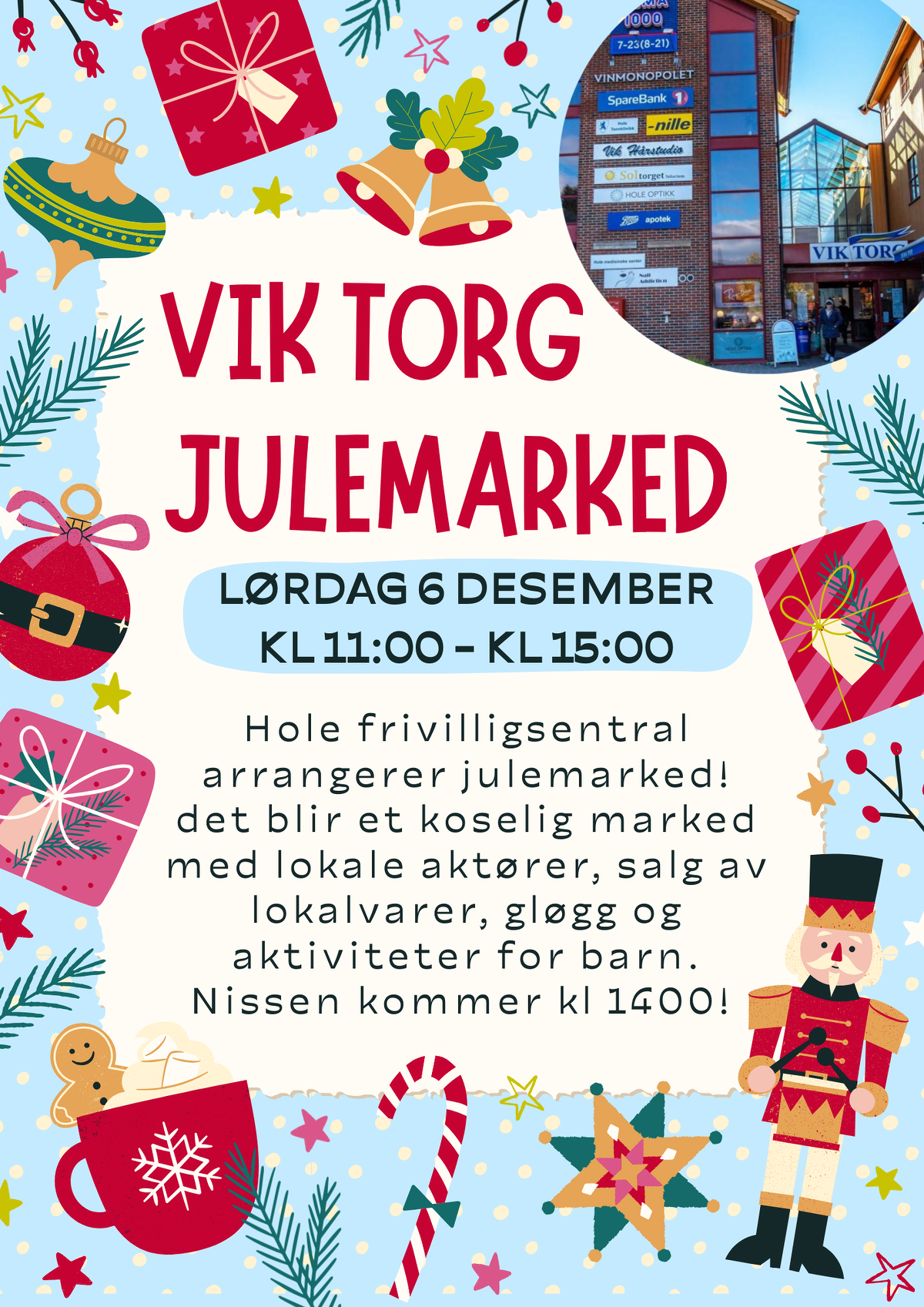 Hole frivilligsentral arrangerer julemarked! det blir et koselig marked med lokale aktører, salg av lokalvarer, gløgg og aktiviteter for barn. Nissen kommer kl 1400!